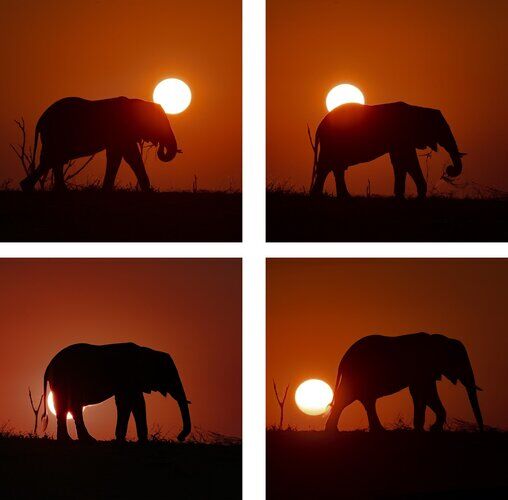This stunning collection features four breathtaking shots of a majestic elephant captured from a boat on Lake Kariba. Watch as this gentle giant moves gracefully against the backdrop of a stunning sunset, perfectly framing each moment with the sun glowing in the background. It's a piece of art that brings the wild right into your home!