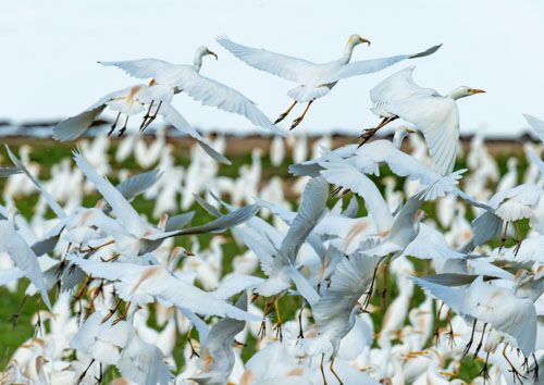 A flock of aigrette in flight after takeoff