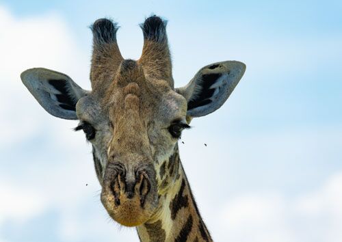 A close-up portrait of a giraffe as she observes us, with some flies surrounding her.